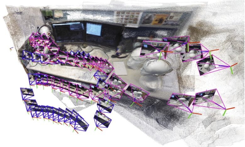 تقسيم المشهد إلى خرائط فرعية صغيرة: حيث يعالج النظام مجموعة صغيرة من الصور لإنشاء “خريطة فرعية” ثلاثية الأبعاد لجزء محدد من البيئة.